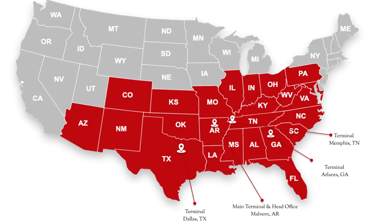 From the Southeast to the Midwest and across the Southwest, JM Bozeman drivers proudly serve customers throughout our core service areas. With a focus on reliability and on-time delivery, our fleet is strategically positioned to cover the regions where our customers need us most.